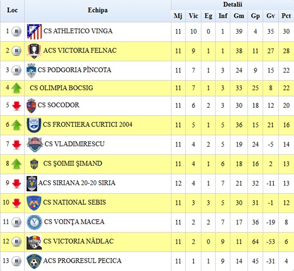 Etapa din acest weekend a Ligii a 4-a a programat două meciuri foarte interesante la Vinga respectiv Socodor. Gazdele de la Athletico respectiv oaspeții de la Victoria Felnac au reușit să se impună în cele două partide și astfel s-au desprins în fruntea clasamentului de echipele adverse. În ligile 5 și 6 am avut, ca de obicei, meciuri spectaculoase, cu foarte multe goluri (niciun scor alb în partidele acestui final de săptămână). Cele mai multe goluri s-au marcat la Fântânele (14), Livada (11) și Horia (10).
