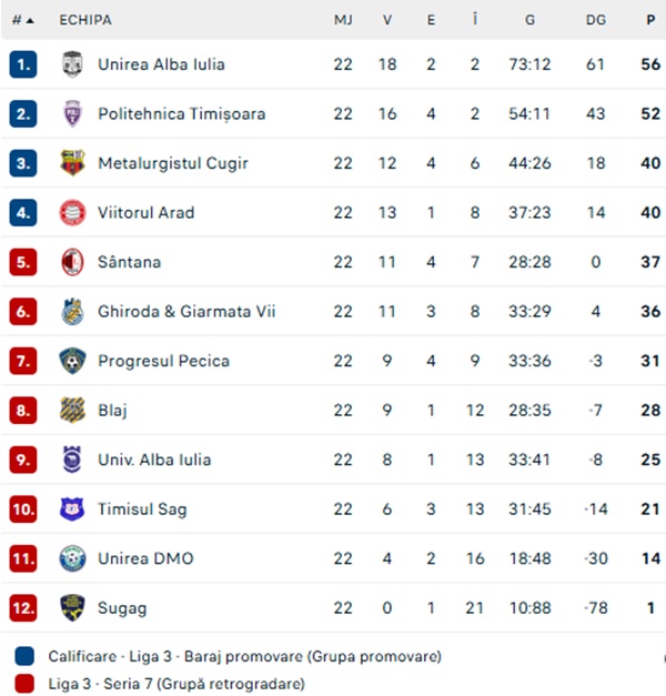 - Unirea Sântana – 37 puncte