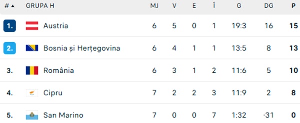 Dacă România face egal la Zenica și învinge San Marino, este nevoie ca Austria să învingă Bosnia-Herțegovina și victoria României în San Marino să fie suficient de concludentă pentru a depăși Bosnia-Herțegovina la golaveraj.